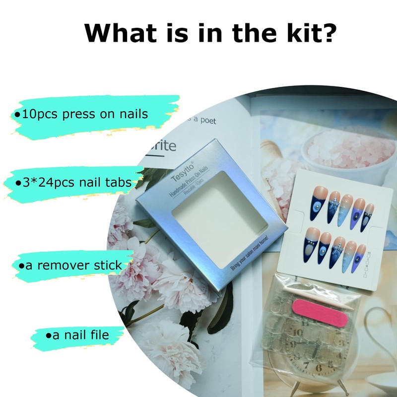 - Packaging Content: 10pcs handmade acrylic press-on nails (Size S), 3*24pcs jelly adhesive tabs, nail file, nail stick