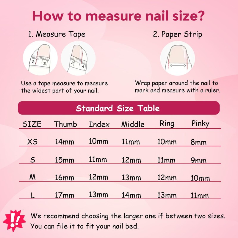- Size Selection: Refer to the size chart in product details. Choose the size matching your nail width. If between sizes, pick the larger one for a comfortable fit