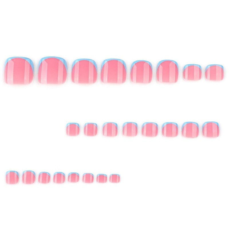 - Package Contents:24Pcs blue french tip fake toenails +1 Nail File + 24Pcs Jelly Glue Stickers+1 Wooden Stick. No matter the size or width of your nails, you can choose the most suitable blue french tip toe nail press ons for yourself. These toenails are suitable for wide toenails