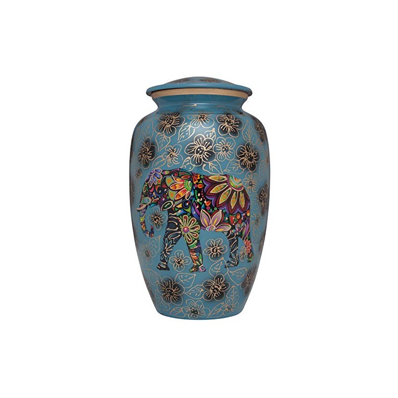 Blue Funeral urn with Elephant - Floral Spiritual Indian Design - Cremation Urn for Human Ashes - Aluminum -Suitable for Cemetery Burial or Niche - Large Size fits Remains of Adults up to 200 lbs