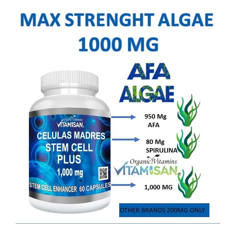 4 bottles celulas madres Vitamisan , We source only the best ingredients and sell them at a reasonable price. Vitamisan blue stem cell celulas madres 1000 mg Our blue green algae is harvested from the fresh clean, blue algae (Afa) and Spirulina are superfood. Beneficios Es 100% natural. Super food Ayuda a restaurar el tejido daado y ayudar en el soperte de su problema Falta de energa Uso : 1 capsula diaria antes o despus del almuerzo Ingredientes: AFA (Aphanizomenon flos-aquae) afa 950 mg Spirulina 80 mg total mg 1000 puede tomar 2 capsules para mayor efectividad