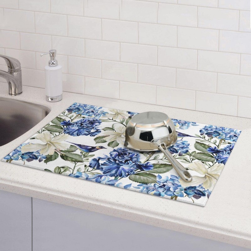 Blue Hydrangea Dish Drying Mat,Flowers Birds Drying Rack Pad Countertop Dishes Ultra Absorbent Microfiber Kitchen Counter Mat for Coffee Countertop Decor 18x24 Inch