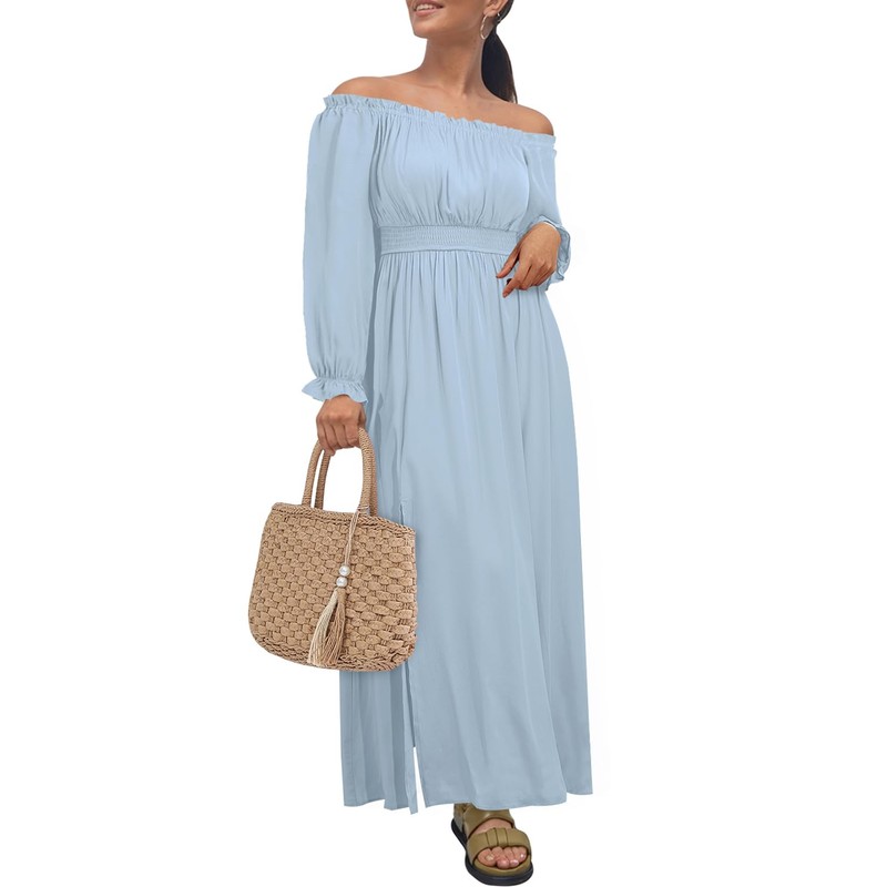 - Feature: Off the shoulder, two side pockets, smocked waist, high split (not too high), boho maxi dress.
