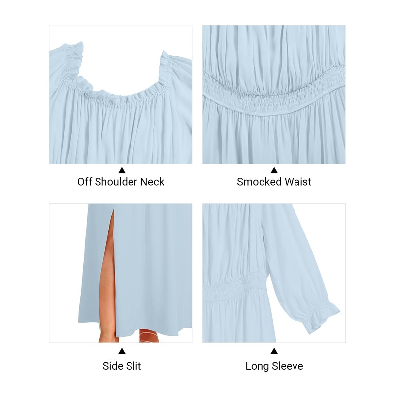 - Design: This simple yet fashionable dress features an off the shoulder design and a split hem for a dynamic feel. The smocked waist design not only ensures comfort but also creates a slender waistline. Whether you have a small or large waist, this dress is suitable for you. The puff sleeve design helps to cover the upper arms, making them appear slimmer.