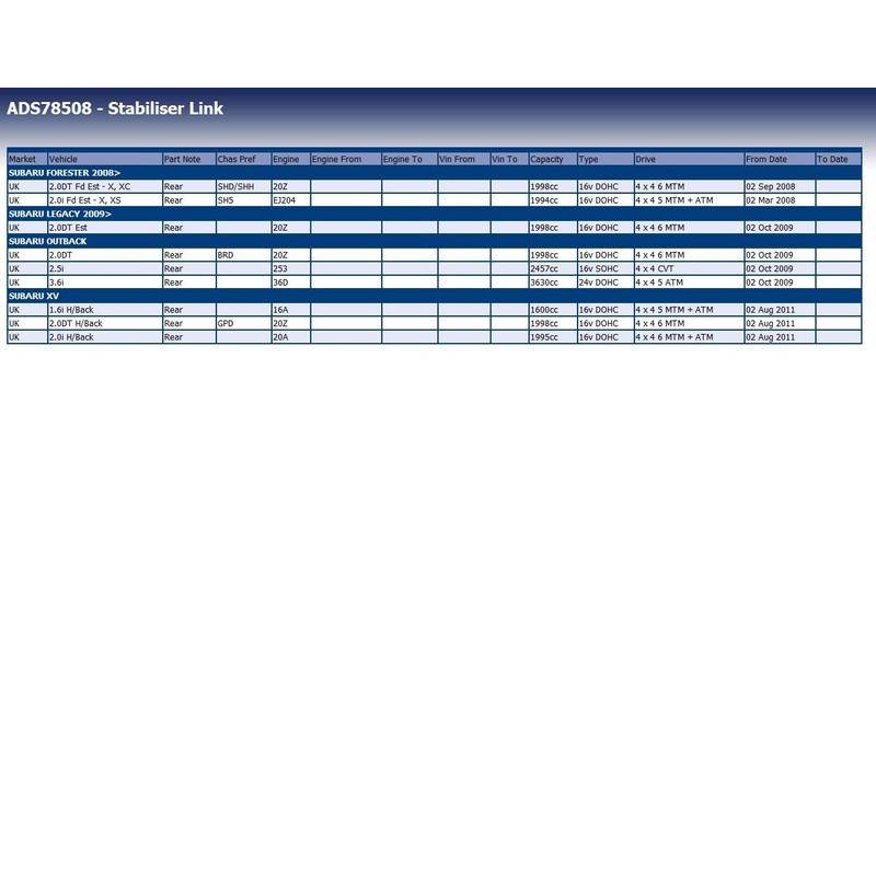 - Suitable for: Subaru: Forester IV 4WD, Forester III 4WD, XV 4WD, Outback V 4WD, Legacy V 4WD, Outback IV 4WD