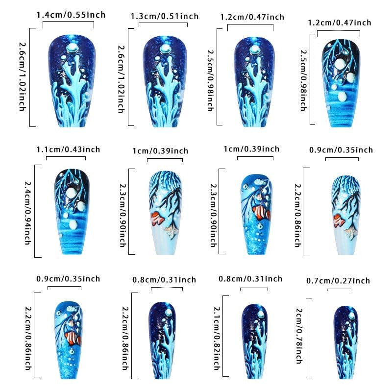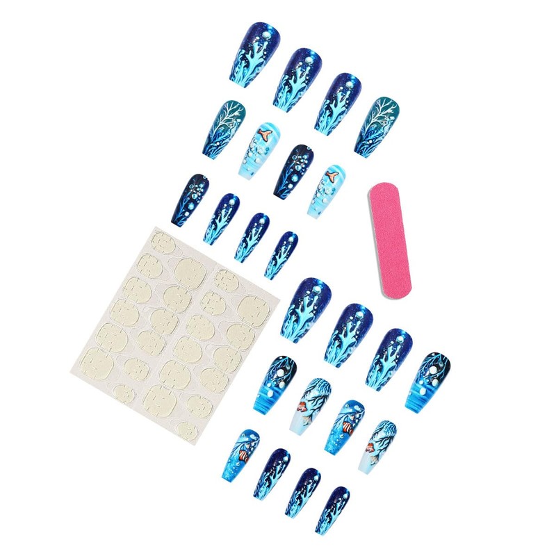 Blue Sea Press on Nails Fish Ocean Series False Nails Seagrass Design Fake Nails Sweet Style French Ballerina Press on Nails Set Ocean Press on Nails 24Pcs for woman and Girls