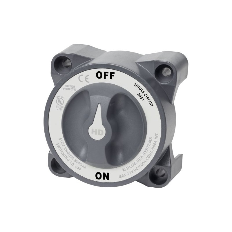 Heavy Duty Battery Switch, MFG# 3001, Grey, 600A cont., 900A int., 32VDC. Positons: single-circuit on-off. 3.85"H x 3.85"W x 3.1"D. With AFD (Alternator Field Disconnect).