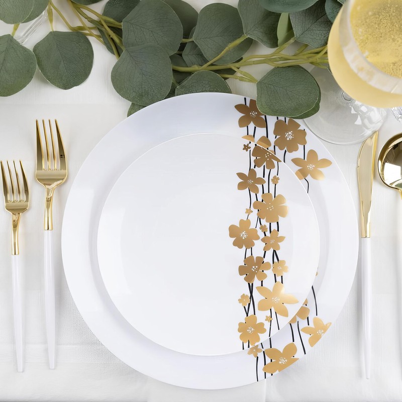 - ELEGANT DESIGN: Our vine plates 9″ disposable plastic plates feature an exquisite white base adorned with a stunning black and gold floral design, perfect for adding a touch of elegance to your parties and special events.