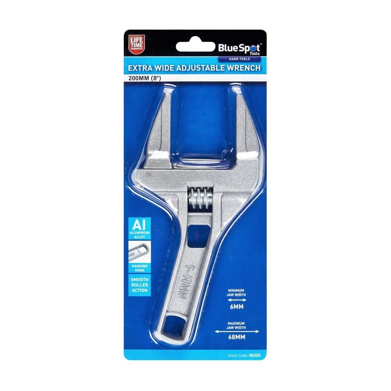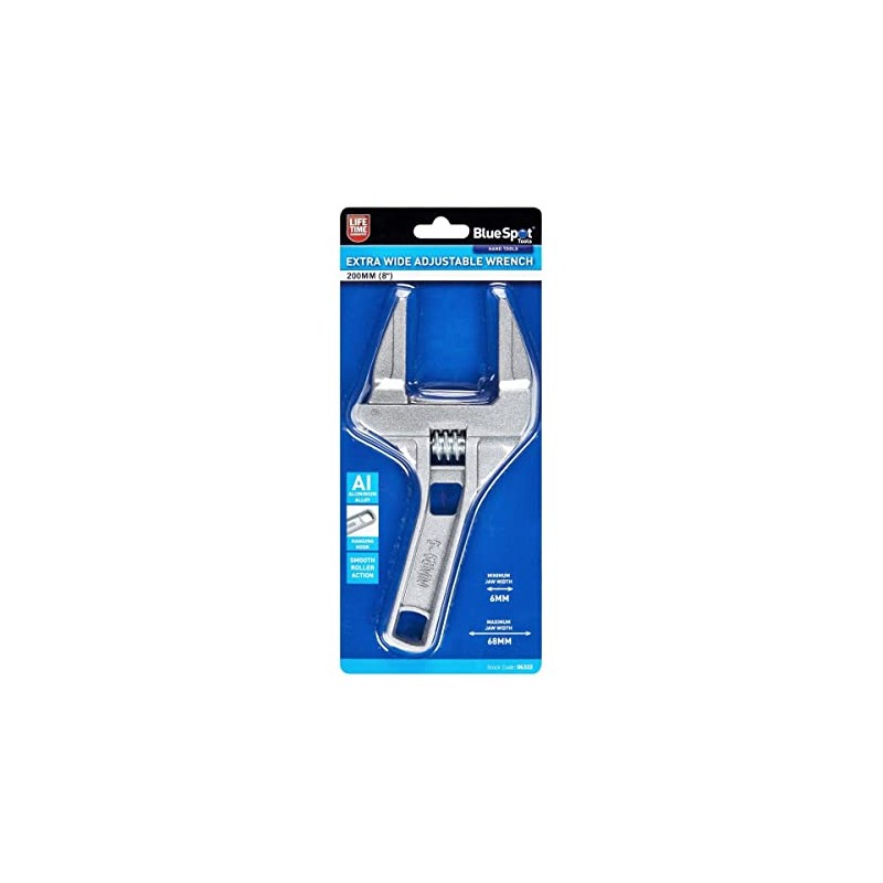 The BlueSpot 200mm (8") Extra Wide Adjustable Wrench is manufactured from aluminium alloy for increased durability. Smooth roller action. Minimum jaw width: 6mm. Maximum jaw width: 68mm.