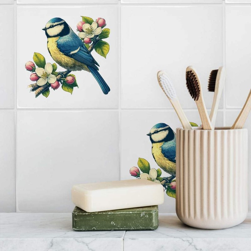 'Blue Tit On Apple Blossom' 108mm Square Ceramic Tile (TD00029486)