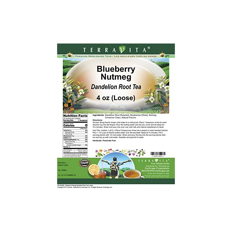 - Our Blueberry Nutmeg Dandelion Root tea is a delicious naturally flavored Dandelion Root coffee substitute with Blueberries, Nutmeg and Cinnamon Chips that you will enjoy relaxing with anytime! The natural and caffeine-free Blueberry Nutmeg taste is delicious! - Ingredients: Dandelion Root, Blueberries, Nutmeg, Cinnamon Chips and Natural Blueberry Nutmeg Flavor.