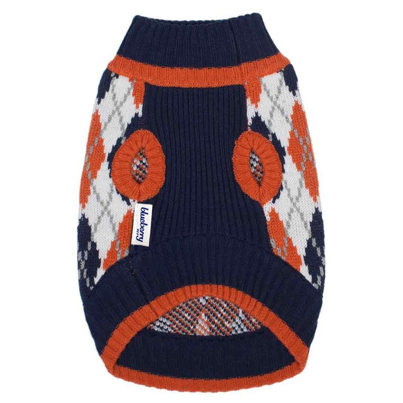 Our sweater design is great for small to medium sized dogs with back length from 8" through 20". Scottish tradition at its best, this argyle all over dog sweater is here to complete your pooches' daily style in a timeless classic look. As any other argyle pattern, this sweater consists of diamonds in a great color choice of midnight blue and dark Princeton orange. Someone may think argyle is outdated and geek. But to our designers, it is just timeless classy and contemporarily chic. Your pooches can never go wrong with this beautifully designed sweater in such elegant pattern.