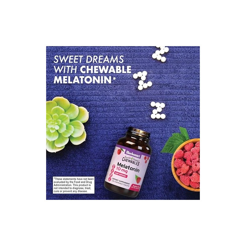 Bluebonnet's EarthSweet Chewables Melatonin 10 mg Tablets help to minimize occasional sleeplessness for those affected by disturbed sleep/wake cycles, such as those traveling across multiple time zones. Sweetened with EarthSweet, a proprietary sweetening mix of fruit powders and sugar cane crystals.*