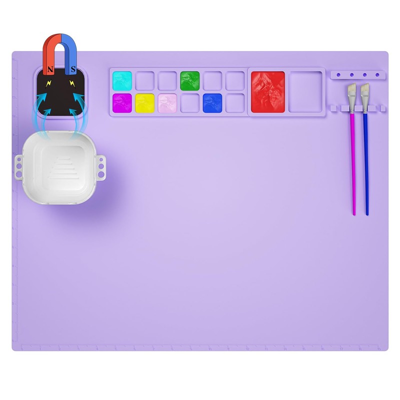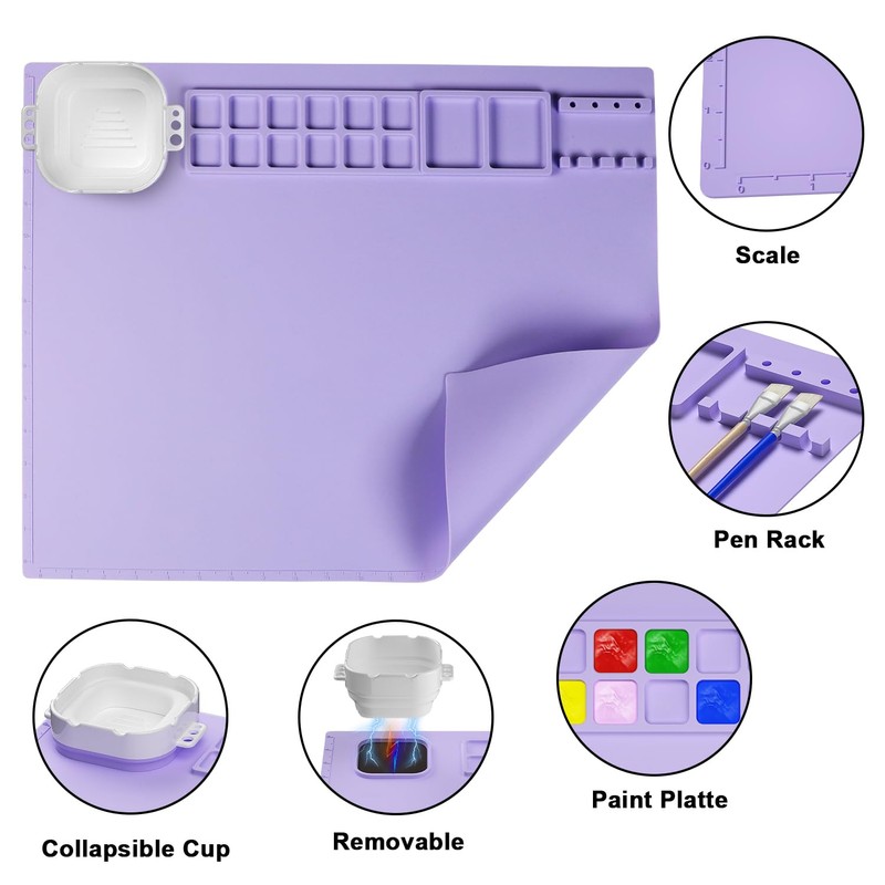 - Design for Convenient: The silicone sheet is designed with 12 paint palette to separately hold multiple colors and 2 larger mixing areas, 4 pen holders to hold your pens; upgraded magnetic removable cup, can be removed any time, allow you to clean the brush in time, it also a collapsible cup, easy to store. Not only that, the scale on the left and bottom of the creator mat, more convenient for your artistic creation.
