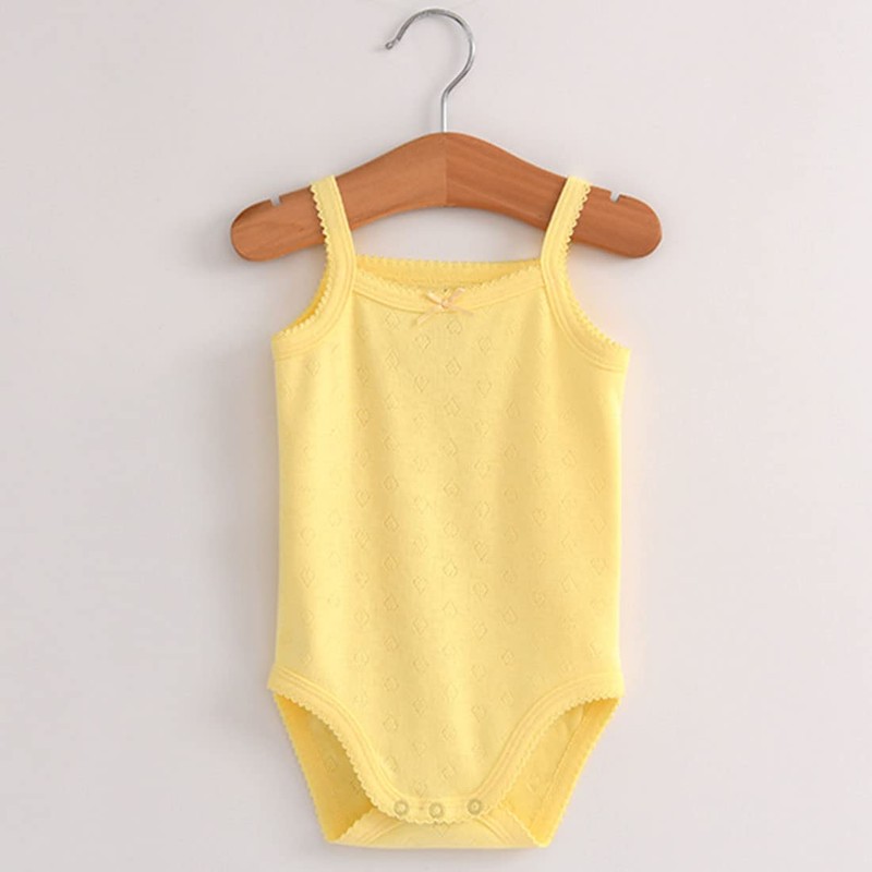 - Grab these soft solid color or assorted print spaghetti strap bodysuit for babies with cute ruffle hem design! These bodysuit offer plush softness for everyday basics, given their ultrafine 100% Cotton composition. Perfect for any situation for your baby. Includes a snap on button bottom opening for easy diaper changing
