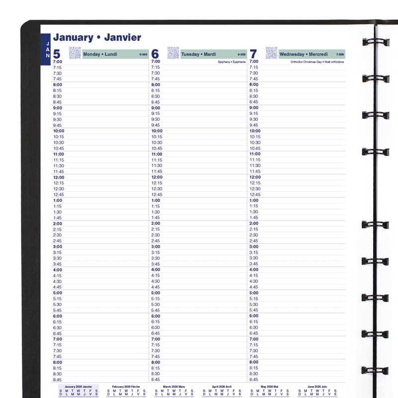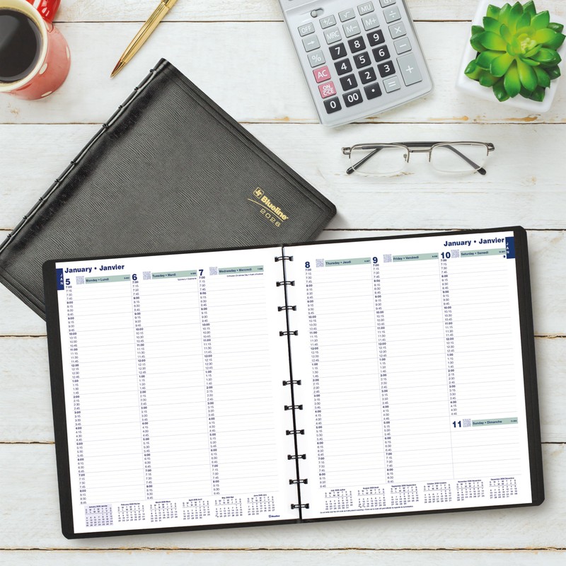 - VERSATILE | The Blueline MiracleBind Weekly Appointment Book and Planner spans 12 months, January to December 2026. Week-on-two-pages, 15-minute appointment schedule from 7:00 a.m. to 8:45 p.m. Saturday 15-minute appointment schedule from 7:00 a.m. to 4:45 p.m. Ruled space for Sunday. Bilingual: English and French.