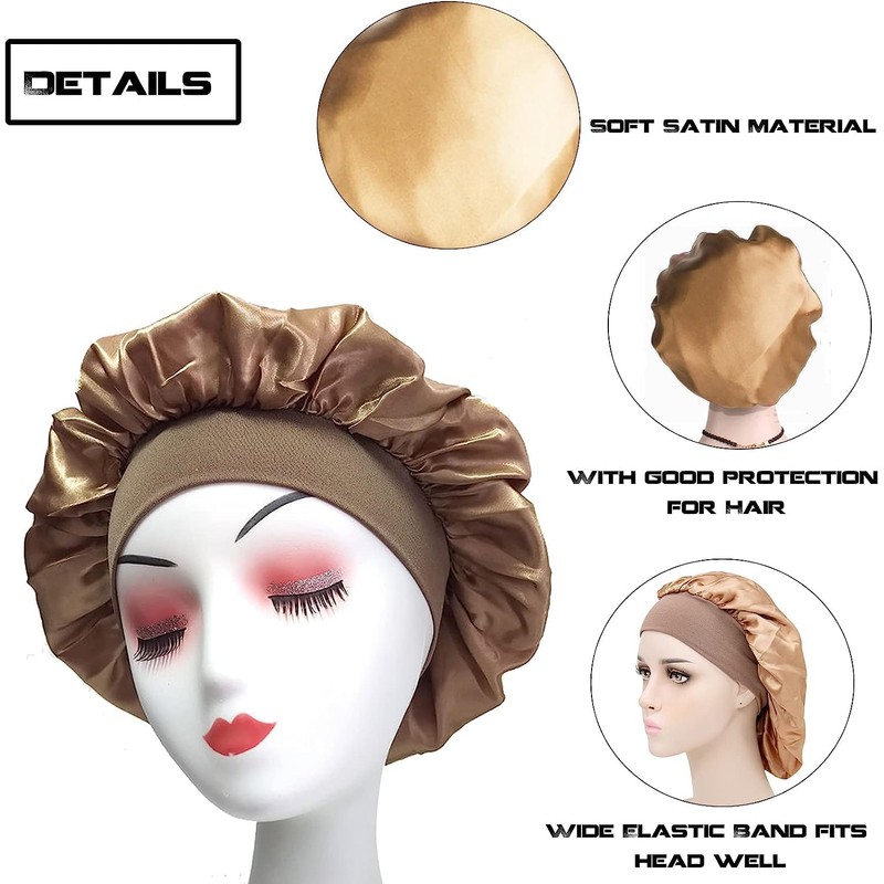 Bluemega Capó Casquete para dormir, Casquete de satén de banda ancha, Casquete de seda para dormir por la noche para mujeres y niñas, Casquete elástico para el cabello negro y rizado para dormir (oro)