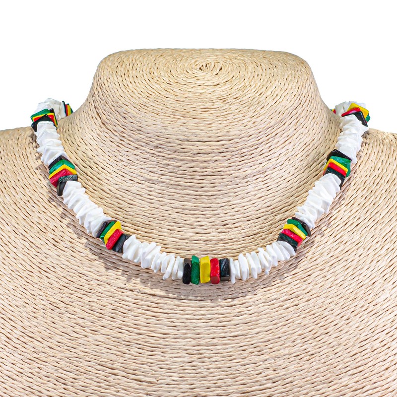 - Vibin' with the spirit of Jamaica, this handcrafted necklace combines coconut shell and shell beads for a unique blend of island style and Rasta flair. Perfect for reggae enthusiasts, beach lovers, and anyone drawn to the island's laid-back vibes, this sustainable accessory is suitable for all genders and ages. Made with biodegradable natural materials, this eco-friendly necklace adds a touch of tropical elegance to any outfit, while its earthy tones and natural textures reflect the Rasta values