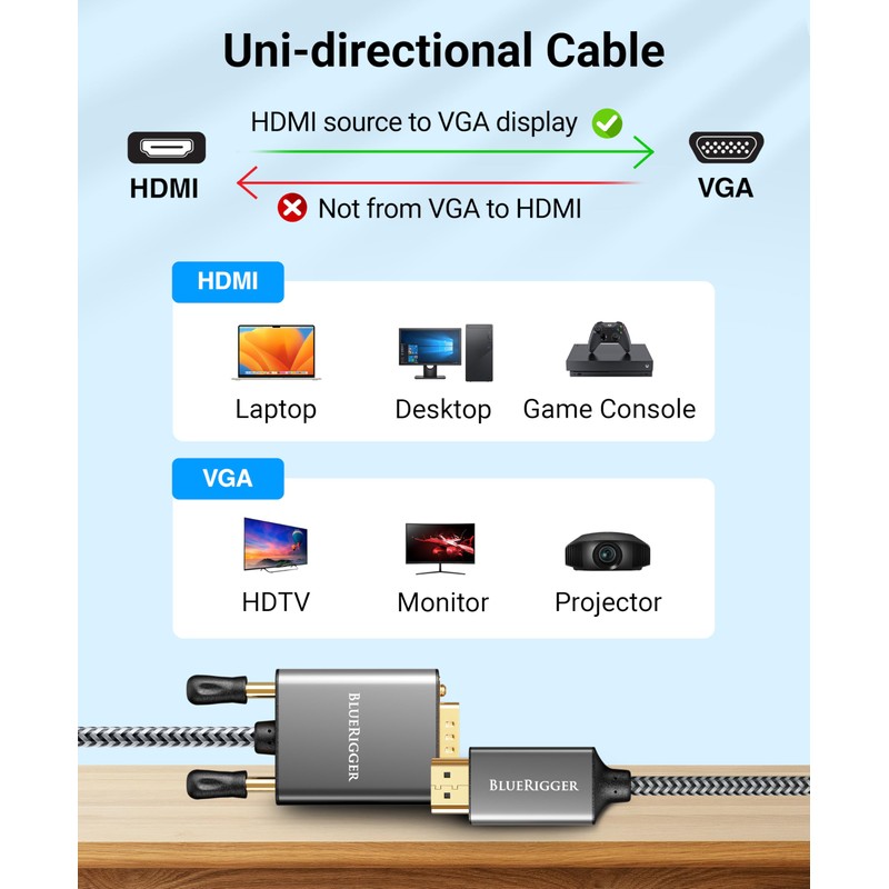 - ➤ UNIDIRECTIONAL VIDEO CABLE: BlueRigger HDMI to VGA cable is the perfect cord to connect laptop to monitor. Easily extend your screen to a bigger display by connecting your computer, desktop or other HDMI devices to a monitor, projector, HDTV or any other device with a VGA port.