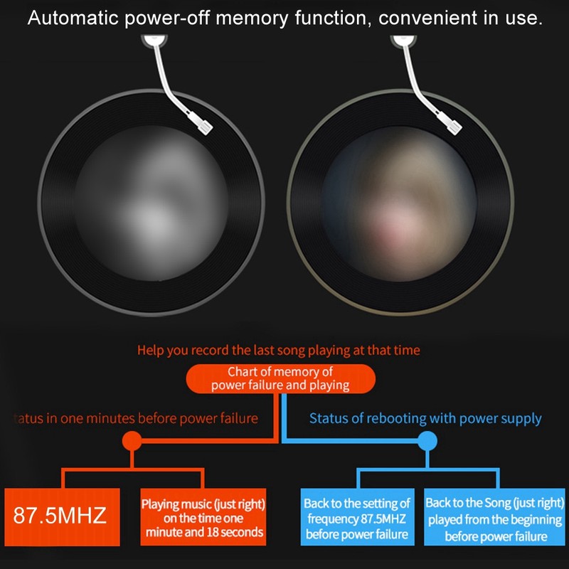 In order to facilitate your use, in general, every time you use the product to power off, the system will automatically memorize the information about your playing track and transmission frequency, and then start playing from the track the next time you use it, but when After you remove or replace the storage device or the system detects an error, the system will automatically resume to the first track and start playing.