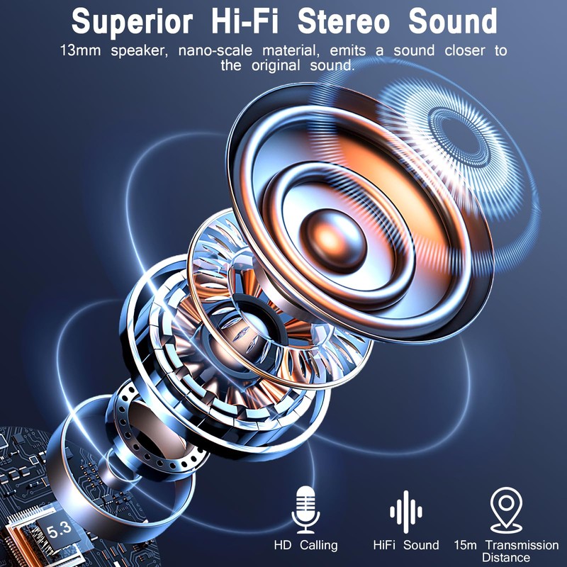 - Bluetooth 5.3 technology and instant connection: the wireless Bluetooth headphones are equipped with class-leading Bluetooth 5.3 technology, which increases the transmission speed of audio data by up to 75% and allows more stable connections with lower power consumption (the transmission range is up to 15 m). With just a few simple operating steps, you can quickly connect to your mobile phone.