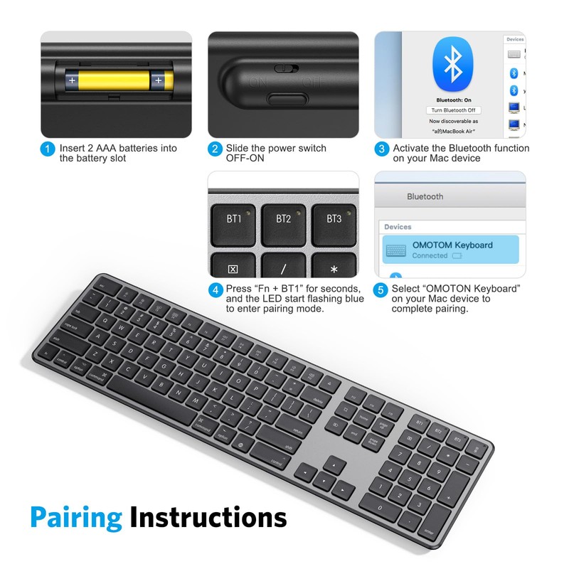 • Full-Size & Ultra-Slim Keyboard: This Bluetooth keyboard for Mac features a full row of MacOS shortcut keys to give you access to all controls (Home, Brightness, Volume, etc.). And the numeric keypad makes entering numbers and basic calculations much easier