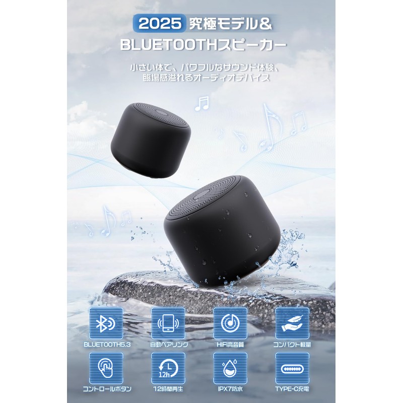 Bluetooth Speaker & Loud Volume, Waterproof, Shockproof, Wireless Speaker, Small, Bath, 12 Hours Continuous Playback, Rapid Charging, IPX7, Bluetooth Speaker, Hands-Free Calling, Built-in Microphone, Mini Speaker, One Hand, Compact, USB-C Connection, Gift, Outdoor, Camping, Fishing, Gaming, Calling, Car, Android, iPhone Compatible (Black)
