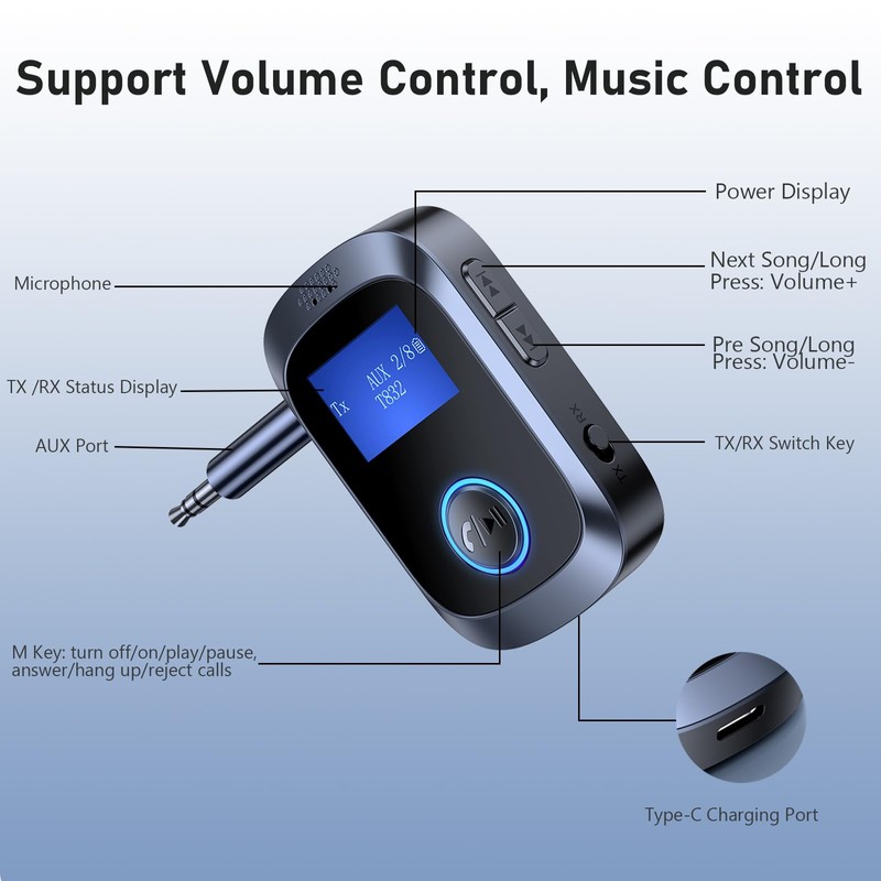 - Support volume control + play/pause/next song/pre-song on the Bluetooth transmitter-receiver.