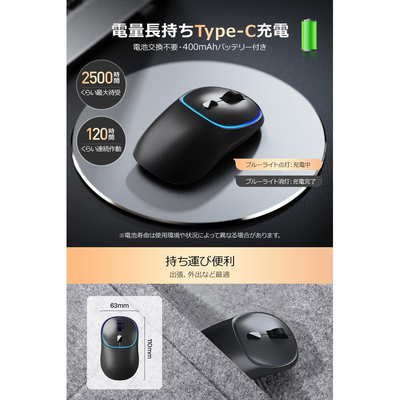 - (Long Standby Time & Type-C Charging) With an extremely long standby time of up to 2,500 hours, you don't need to charge it frequently, so it is quite a lot of hassle. It also has a long 120 hours of continuous operation so you don't have to worry about stopping working while connecting. The wireless mouse is also typc-c charging, so you can charge it very fast and you don't have to worry about long distance travel
