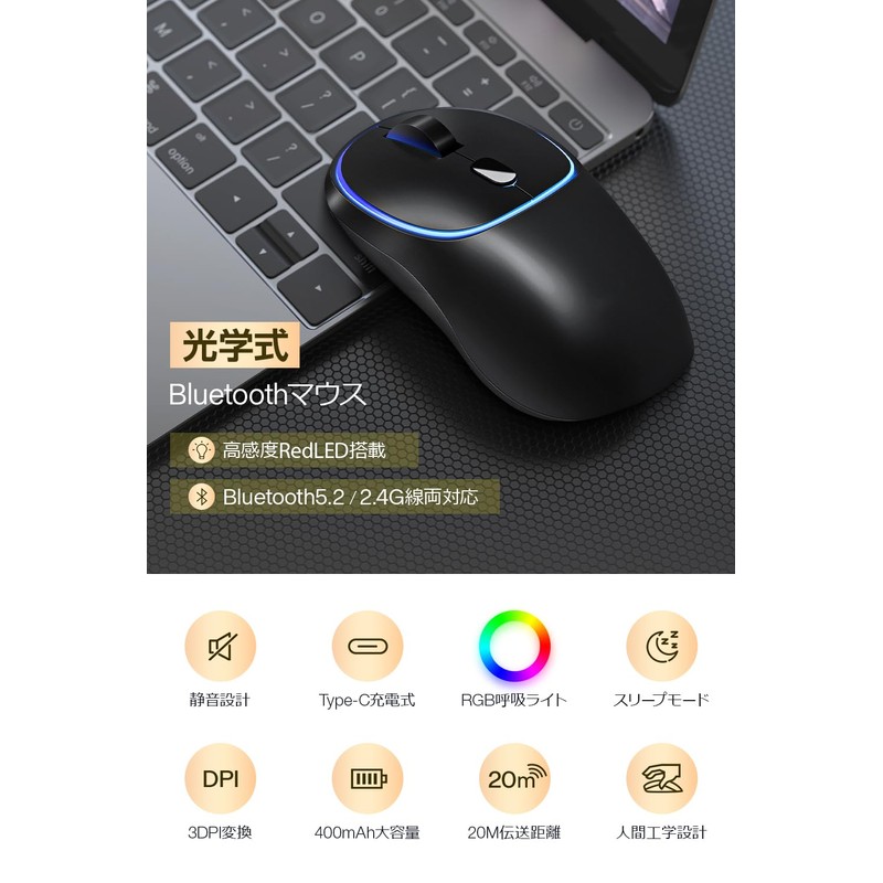Bluetooth Wireless Mouse, Multi-Connection, Bluetooth 5.2, Wireless Mouse, 3 Stage DPI Switch, 2.4 GHz, Silent Mouse, Ambidextrous, Ambidextrous, Power Saving Model, Thin, Highly Sensitive, RGB
