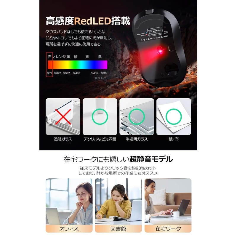 - 【Bluetooth 5.2 & High Sensitivity Red LED】 Wireless mouse adopts Bluetooth 5.2 technology, no cable needed, so you can operate it comfortably. Easy to connect with Windows, Mac, iPad, Android and more and easy to set up. Fast and low latency connections Switching between multiple devices smoothly, providing a comfortable experience and significantly increases your work and learning efficiency. Equipped with highly sensitive LEDs, it will make your life more richer while freeing your hands. This practical and beautiful mouse will bring you a happy net life