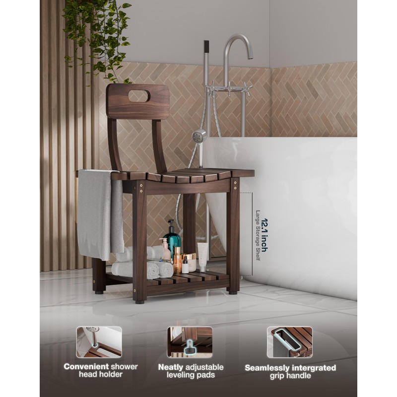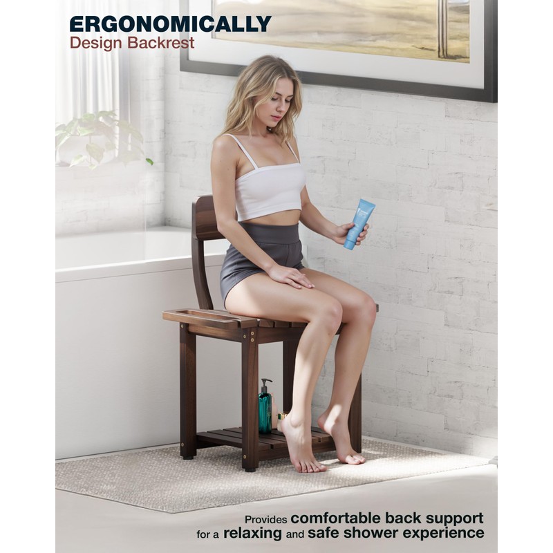 BLUEWEST 23.4'' Shower Chair with Backrest Bath Chair for Inside Shower or Tub, Heavy Duty 450 lbs Support, Non-Slip Feet, Shelf Storage, Built-in Handles for Elderly or Adults (Acacia)