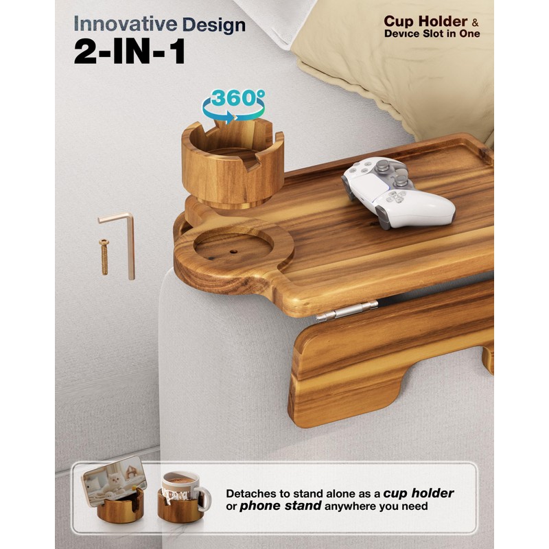 BLUEWEST Couch Cup Holder Tray & Sofa Arm Tray – Large 2-in-1 Acacia Wood Clip-On Tray Table with 360° Cup Holder on Armrest, Double SS304 Hinges, Non-Slip, Flexible Fit for Different Sofas