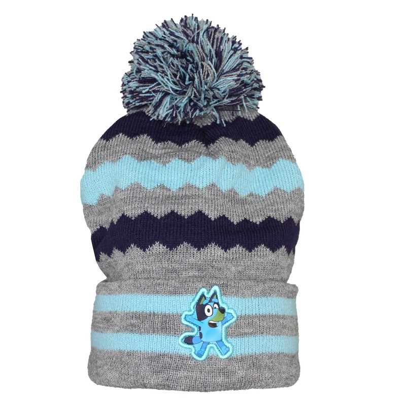 - FUN DETAILS: This beanie hat is topped with a fluffy, yarn-knit pom-pom and a rolled brim for extra flair, while the gloves feature light blue cuffs and a “Bluey” applique with a gripper texture.