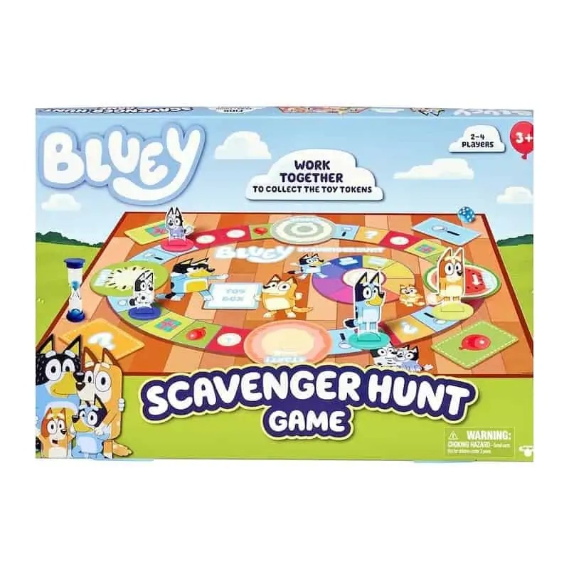 It’s almost time for bed, but Bluey and her friends want to play a game of Scavenger Hunt. The Bluey Scavenger Hunt Game is all about finding, playing and collecting. Players must work together as a team to find 12 toy tokens. The first one to collect enough tokens and get to the finish line wins! This fun game is full of fun activities to perform, fun things to find and fun questions about Bluey to answer.