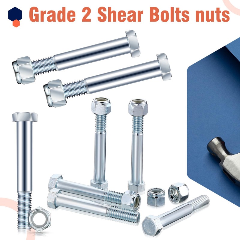 - Resistance to Vibration: the nylon lock nuts offer increased friction keeping the nut locked into position, grade 2 shear bolts can simple and effective way of protecting your equipment from damage