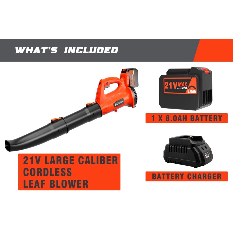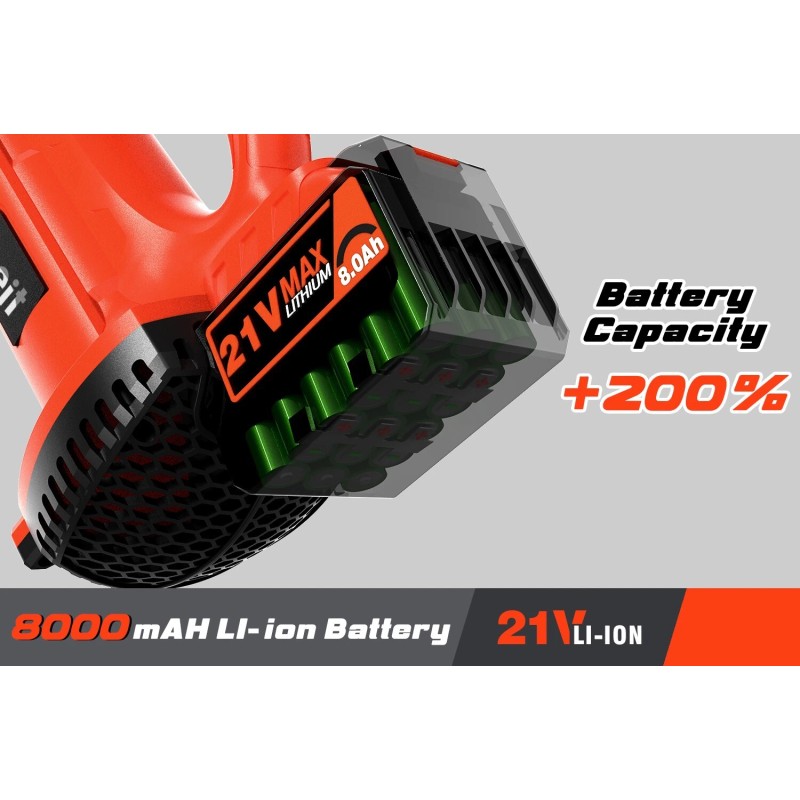 - Ultra Long Runtime & Fast Charging | 8.0Ah Battery - Equipped with a high-capacity 21V 8.0Ah battery and a fast charger, this leaf blower delivers up to 35 minutes of continuous runtime at max speed. Recharge fully in just 5 hours, keeping your yard work efficient without frequent interruptions. 🔋Note: Please fully charge the battery before first use to ensure optimal performance.