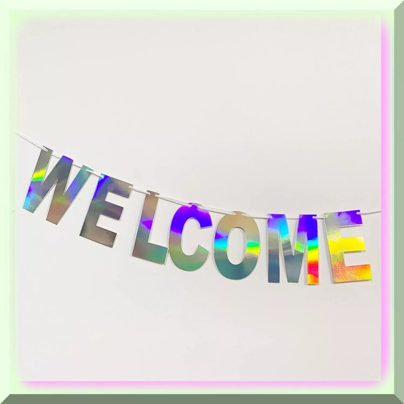 - A) Holographic Wonder: Unleash the enchantment of our holographic WELCOME banner, designed to captivate and mesmerize. Its shimmering allure will transport you to a realm of pure magic, leaving guests spellbound and eager to explore further. B) Ribbon Extravaganza: Prepare to be awestruck by the abundance of ribbon that accompanies our package. With an ample supply of extra ribbon, you'll have the freedom to unleash your creativity and adorn your space with lavish elegance. Let your imagination run wild as you indulge in a ribbon extravaganza like no other. C) Versatile Charm: Our holographic WELCOME banner is not only a visual delight but also a versatile addition to any occasion. Whether it's a grand celebration or an intimate gathering, this charming banner effortlessly adapts to any setting, infusing it with a touch of sophistication and warmth. D) Convenience Redefined: We understand the importance of convenience, which is why our package includes extra ribbon. No need to worry about running out or making last-minute trips to the store. With our thoughtful inclusion, we redefine convenience, ensuring that your experience is seamless and stress-free.