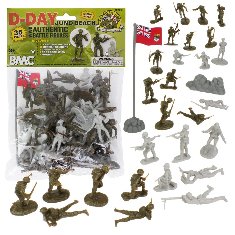 From the BMC Toys AMERICAN HERO COLLECTOR SERIES, the greatest invasion in military history: The D-DAY June 6, 1944 Juno Beach 35 piece plastic army men expansion pack features 22 Canadian troops in khaki green, 10 German soldiers in light gray, Canada's flag, and a rock formation.