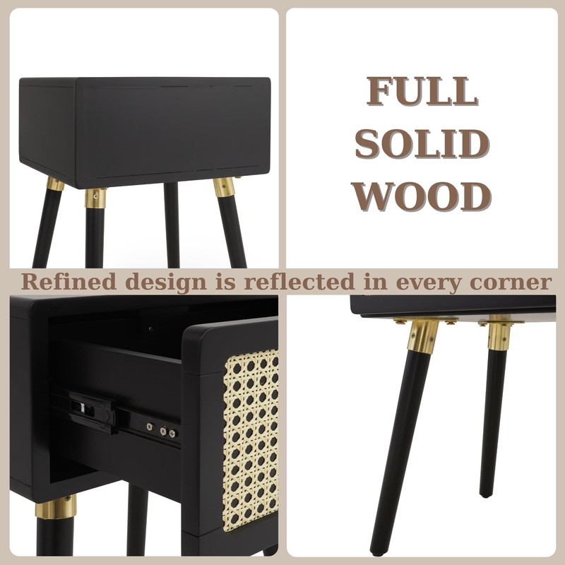 Bme Nipe Black Solid Wood Rattan Nightstand Fully Assembled, Woven Cane End Table, Bedside Table for Modern Bedroom, Boho Living Room with Long Wood Legs Large Storage 1-Drawer
