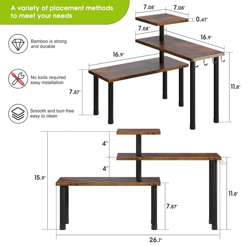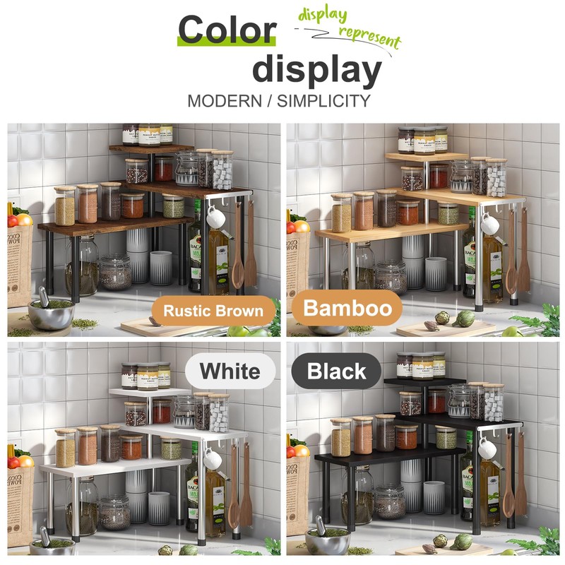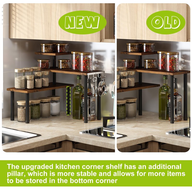 BMOSU Kitchen Corner Shelf Countertop Organizer with Hooks Adjustable Spice Rack Corner Display Rack Shelf Cabinet Counter Shelves(Rustic Brown)