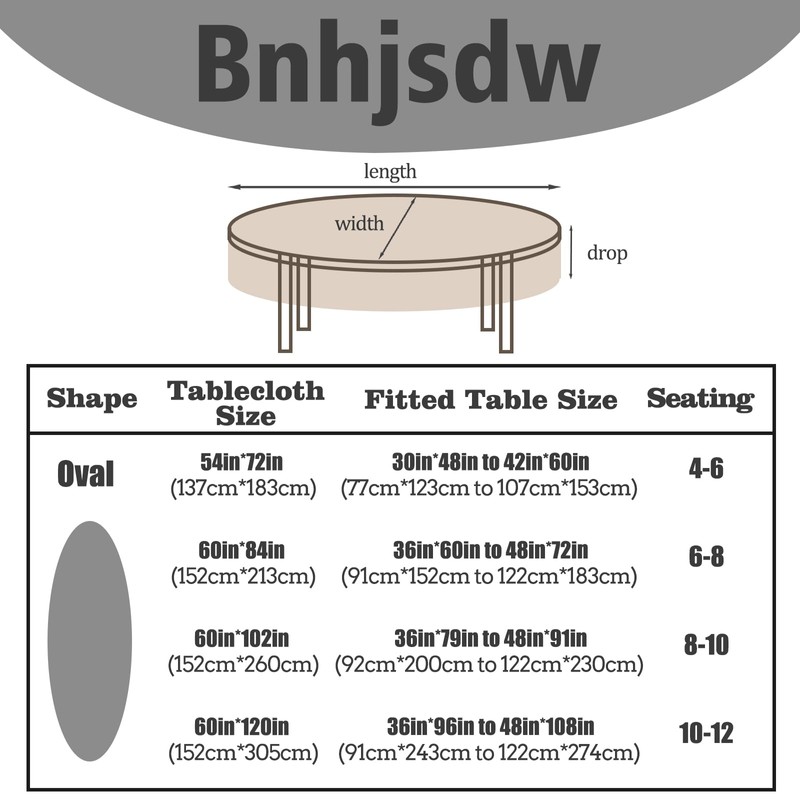 - Fits Most Tables: Size guide: 54 x 72 inches - for tables between 28"-40"wide and 46"-54"long. 60 x 84 inches - for oval tables between 36"-48"wide and 60"-72"long. 60 x 102 inches - for oval tables between 36"-48"wide and 78"-92"long. 60 x 120 inches - for oval tables between 36"-48"wide and 96"-108"long.Any size confusion, please contact me with your table size and I will recommend a suitable size for you.
