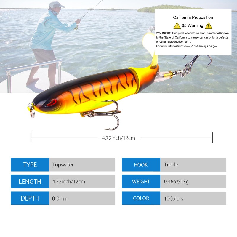- What You Will Get: The product includes 10 topwater bass lures of different colors, 10 cm long and weighs 13g. Fishing lures with bult-in gravtity balls give the plopper lure a unqiue sound that attract fish