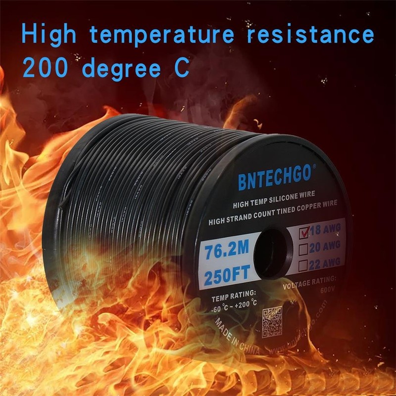 1.High Quality Ultra Flexible Soft Silicone Rubber Copper Wire!Super Low Impedance,Highly Efficient! 2.High strand count copper core,18 AWG silicone stranded wire has 150 strands 0.08 mm tinned copper wire,the copper strands are tinned,protecting them from corrosion and making it easier to solder. 3.They are constructed with premium silicone rubber insulation.High temperature resistance 200 degree C,Low temperature resistance,in extreme cold -60 degree C.Rated Voltage: 600 volts.Outside diameter 2.3 mm,tolerance +/- 0.1 mm. 4.18 gauge silicone wire spool: Black total 250 feet. 5.BNTECHGO silicone wire are widely used for model planes,model cars,model ships,lamps,household appliances,electric heating appliances,meters,instruments,motor and digital fields. **Also available the right gauge wire from thin 30 AWG to heavy duty 8 AWG silicone wire.8 AWG and 10 AWG available red and black;12 AWG and 14 AWG available 7 colors(Red,Black,Blue,Yellow,Green,White and Gray);16 AWG to 30 AWG available 11 colors(Red,Black,Blue,Yellow,Green,White,Brown,Gray,Purple,Orange and Pink).**