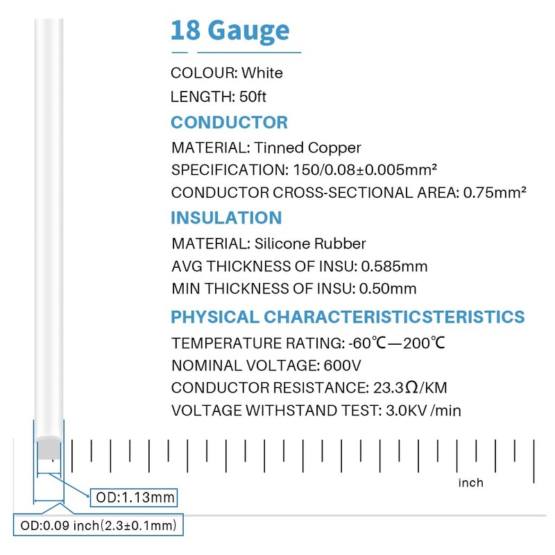 1.High Quality Ultra Flexible Soft Silicone Rubber Copper Wire!Super Low Impedance,Highly Efficient! 2.High strand count copper core,18 AWG silicone stranded wire has 150 strands 0.08 mm tinned copper wire,the copper strands are tinned,protecting them from corrosion and making it easier to solder. 3.They are constructed with premium silicone rubber insulation.High temperature resistance 200 degree C,Low temperature resistance,in extreme cold -60 degree C.Rated Voltage: 600 volts.Outside diameter 2.3 mm,tolerance +/- 0.1 mm. 4.18 gauge silicone wire spool: White total 50 feet. 5.BNTECHGO silicone wire are widely used for model planes,model cars,model ships,lamps,household appliances,electric heating appliances,meters,instruments,motor and digital fields. **Also available the right gauge wire from thin 30 AWG to heavy duty 8 AWG silicone wire.8 AWG and 10 AWG available red and black;12 AWG and 14 AWG available 7 colors(Red,Black,Blue,Yellow,Green,White and Gray);16 AWG to 30 AWG available 11 colors(Red,Black,Blue,Yellow,Green,White,Brown,Gray,Purple,Orange and Pink).**