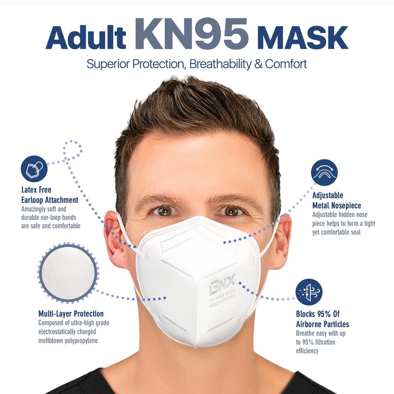• [BNX Quality Promise & Applications] BNX is committed to delivering the highest quality American made safety products using the latest automated manufacturing processes and technology and the strictest quality standards. Our KN95 face masks are ideal for use in crowded or contaminated areas such as: Commercial Buildings, Construction, Food Processing, Food Safety, Retail, General Manufacturing, Infrastructure, Mining, Oil & Gas, Transportation, and more.