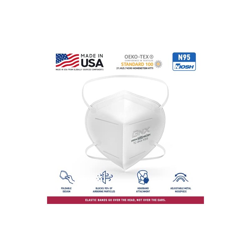 • Fabricado en Estados Unidos – Fabricado por BNX Converting LLC en Houston TX, un fabricante aprobado por NIOSH/CDC y registrado en la FDA (registro # 3017489417) fabricante de respiradores de máscara N95.