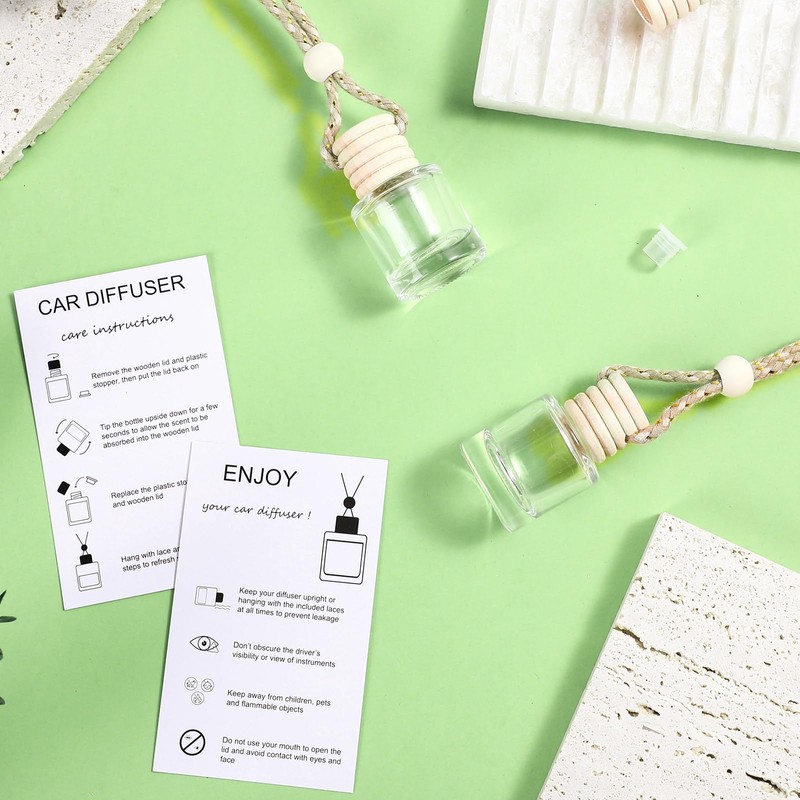 - Package Set: this air freshener bottles cards set includes 50 hanging empty car diffuser bottles and 50 diffuser instruction cards; An ample supply of perfume bottles paired with clear and concise car diffuser instruction cards makes this set ideal for your car air freshener diffuser needs