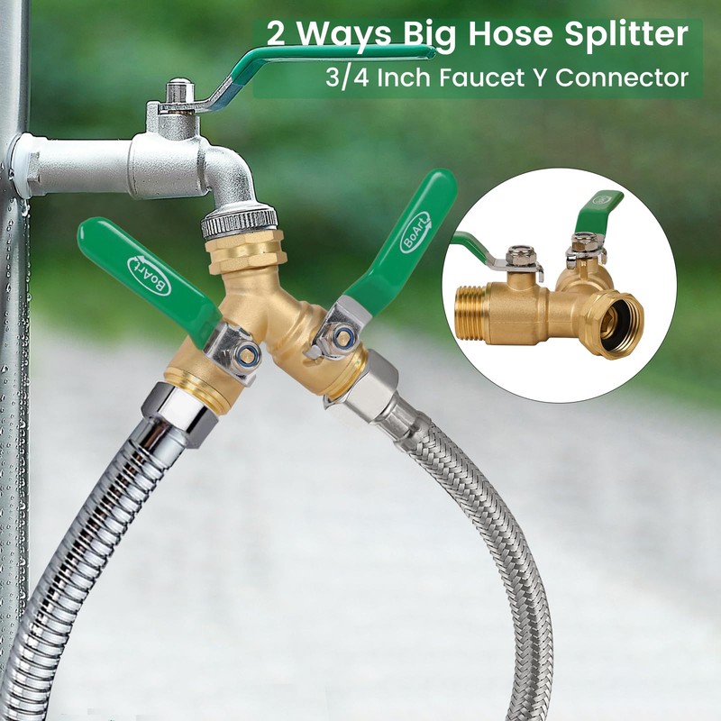 BoArt Brass Garden Hose Splitter 2 Way Heavy Duty, Y Valve Hose Splitter With Stainless Steel Long Handle, 3/4" GHT Thread Y Valve Water Garden Hose Tap Adapter