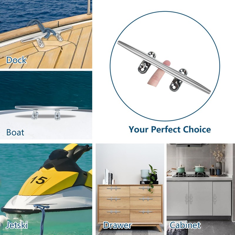 - 【WIDELY USED】: This dock cleats 10 inch will add a definite nautical vibe, place it anywhere to revolutionize your space, not only a great match for marine use docks, decks, piers, kayaks, jet skis, beaches, Garden, swimming pool, etc., you can freely install them in any DIY home nautical decoration, such as cabinet pulls, marine cleat hooks for towels, rustic coat hangers, curtain ties, nautical coat hooks, etc., bring the ocean style into Indoors, make your home stand out.
